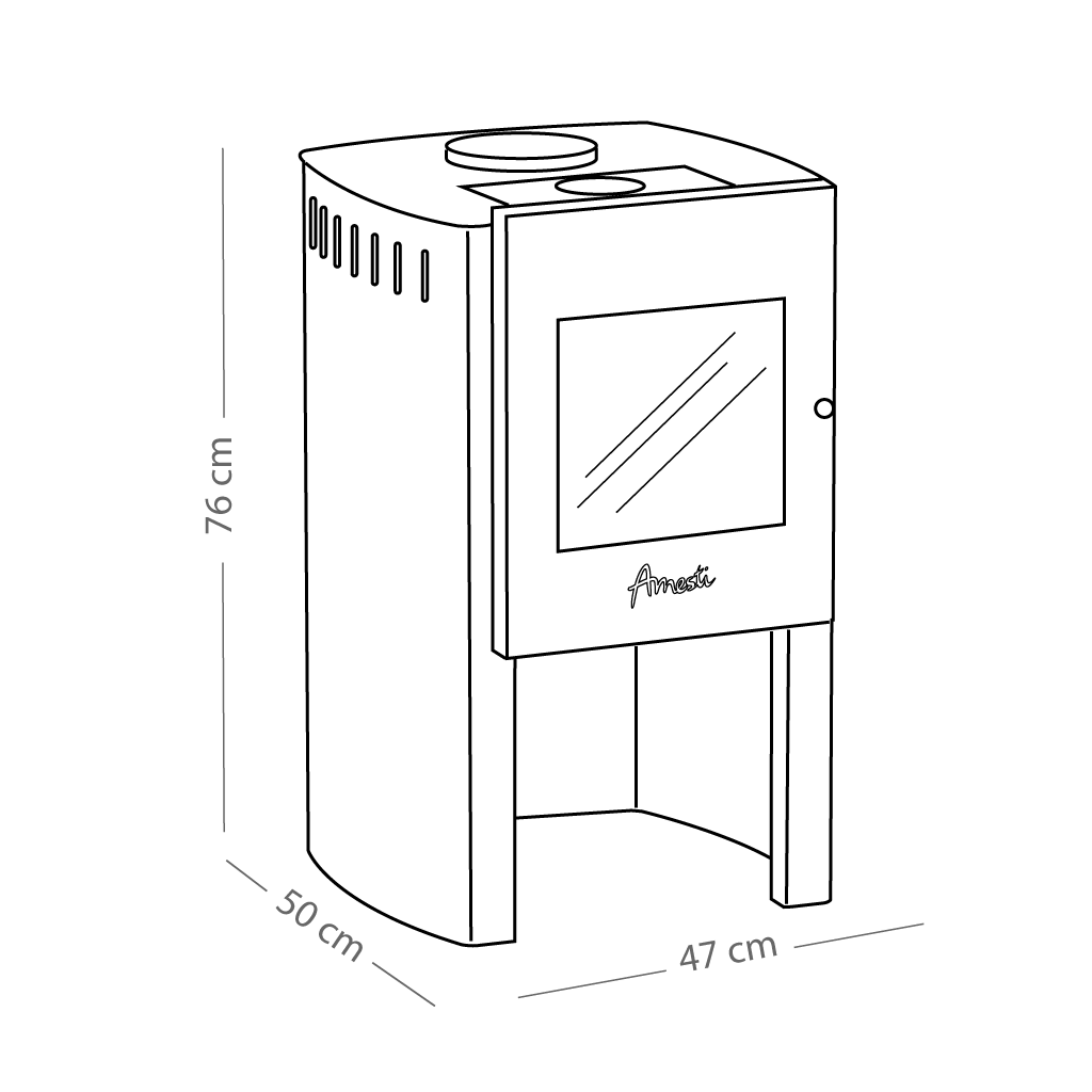 Integra un sistema de apertura mediante manilla fría, diseñada para una manipulación más segura. Además, cuenta con un compartimiento para almacenar leña seca, facilitando su uso en el día a día.
